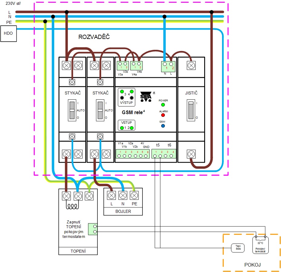Váš původní prostorový termostat je nastaven na tzv. komfortní teplotu (například 22°C). Teplotní čidlo (např. GSM-C-T2) je zapojené do teplotního vstupu GSM-R5-DIN.
